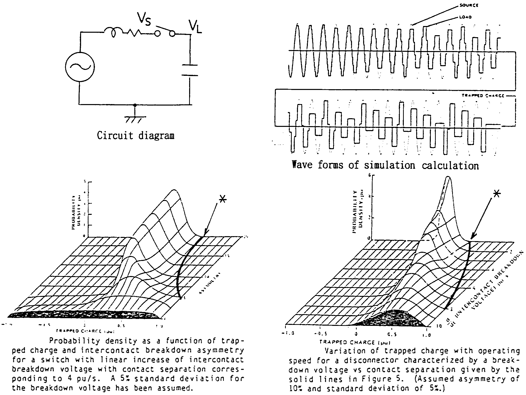 Due to slow speed of contact movement of a disconnector, multiple restrikes/reignitions occur during switching bus charging currents by it. Typical simulated voltage wave form of the load side (capacitance) voltage is shown below. During switching off, the final trapped voltage in the capacitance is below 1 p.u. in the example. The value is affected by the electrical asymmetry of the contact (difference of discharging voltages of positive and negative polarities), speed of the contact movement, scattering of the discharging voltages, point on wave timing of the initiation of the contact movement, etc.
