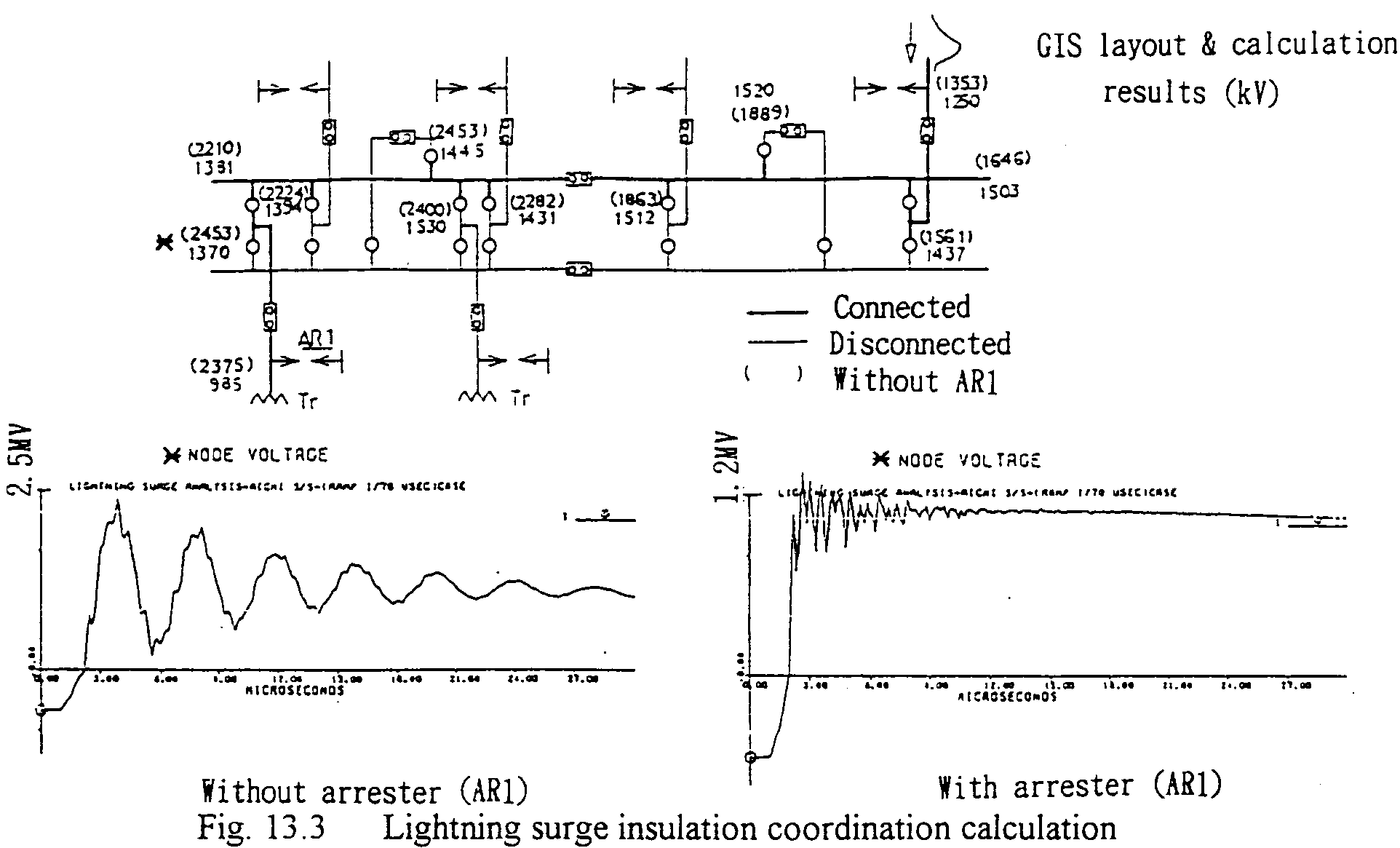 For the insulation coordination process against lightning surge over voltages, i.e., survey of the lightning over voltage propagation in the sub-stations and to find the appropriate locations of these, EMTP has been widely and effectively applied. An example is shown in Fig. 13.3.