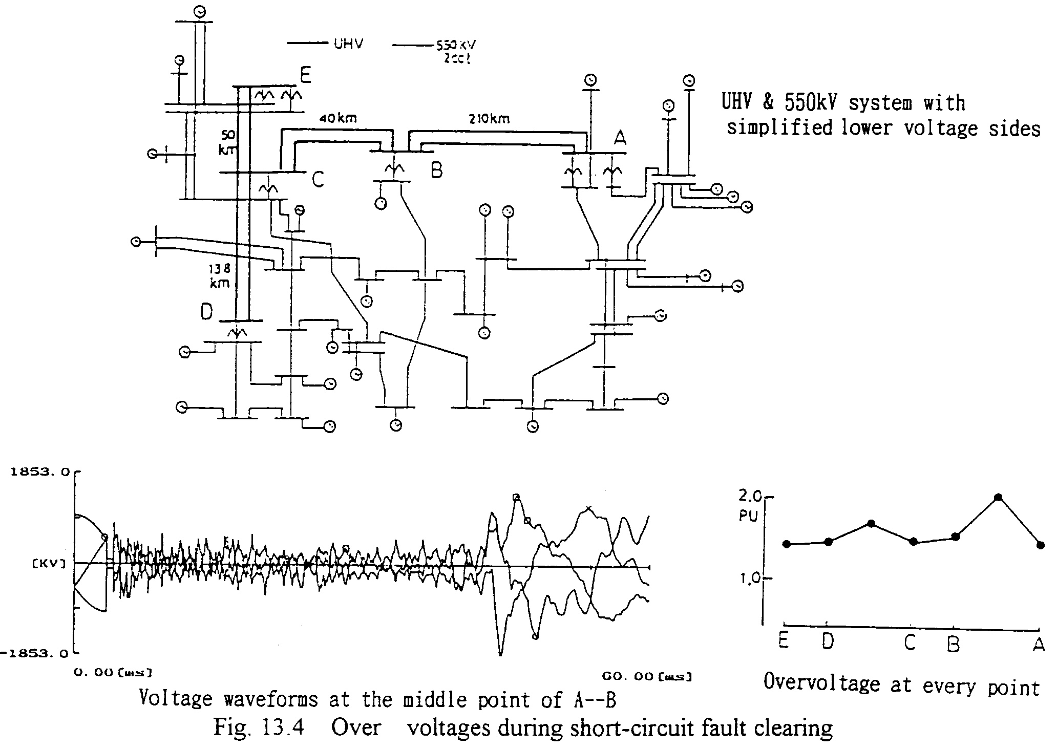 In sub-stations, also switching over voltages can be suppressed by surge arresters within safety levels. In transmission lines, nevertheless, due to no surge arrester exists along the lines, possible over voltages may not be suppressed. A lot of simulation calculations have been done and for the initial step of Japanese UHV system, "Soft switching circuit-breakers," i.e., inserting resistors during the switchings, are to be introduced. In future, When many sub-stations will be installed, where sub-stations will be located within relatively short distances from another, the over voltage at any part of the transmission lines will be suppressed by surge arresters installed at sub-stations. So, circuit-breakers without switching parallel resistors may be applied. As for switching over voltages by circuitbreakers, closings of no load transmission lines with probable trapped voltages and short-circuit fault clearings are the main causes. For the former cause, see chapter 3 of this text. For the latter, see Fig. 13.4, which shows typical over voltages during fault clearing at the far remote location.