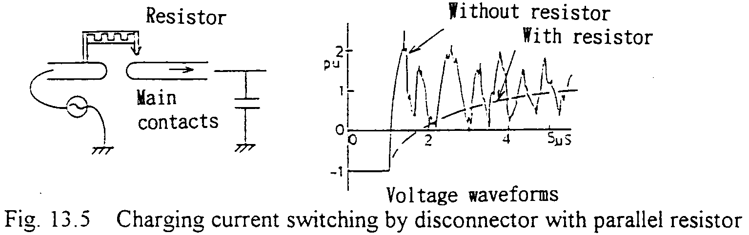 As shown in chapter 11, disconnectors are obliged to switch charging currents of the buses between the disconnectors and the series connected circuit-breakers. When switching, multiple restrikes occur followed with very high frequency of over voltages (in the order of several MHz). The maximum magnitude is ca. 2.5 p.u. of the service voltage. Such over voltages are not permissible in UHV GIS, so disconnectors with parallel inserting resistors will be applied. See Fig. 13.5.