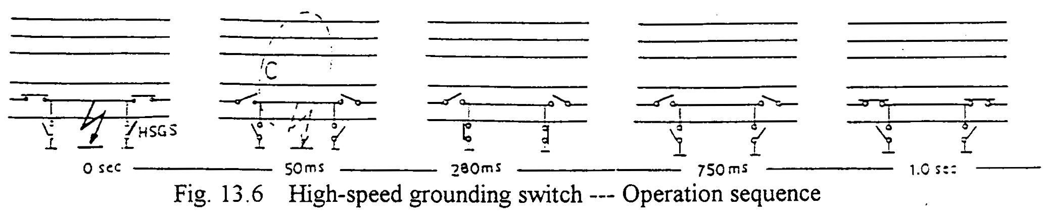 For the successful high speed auto reclosings in case of, especially, one line to ground faults, which are actually the most probable fault cases in systems, quenching of secondary arcs in transmission lines are furthermore important and difficult in UHV transmission systems. 4-leg type reactors (See chapter 3, Supplement) have been discussed a lot, but never have come to an appropriate conclusion. So, the high speed grounding switches, shown in Fig. 13.6, are possibly the best solution today.