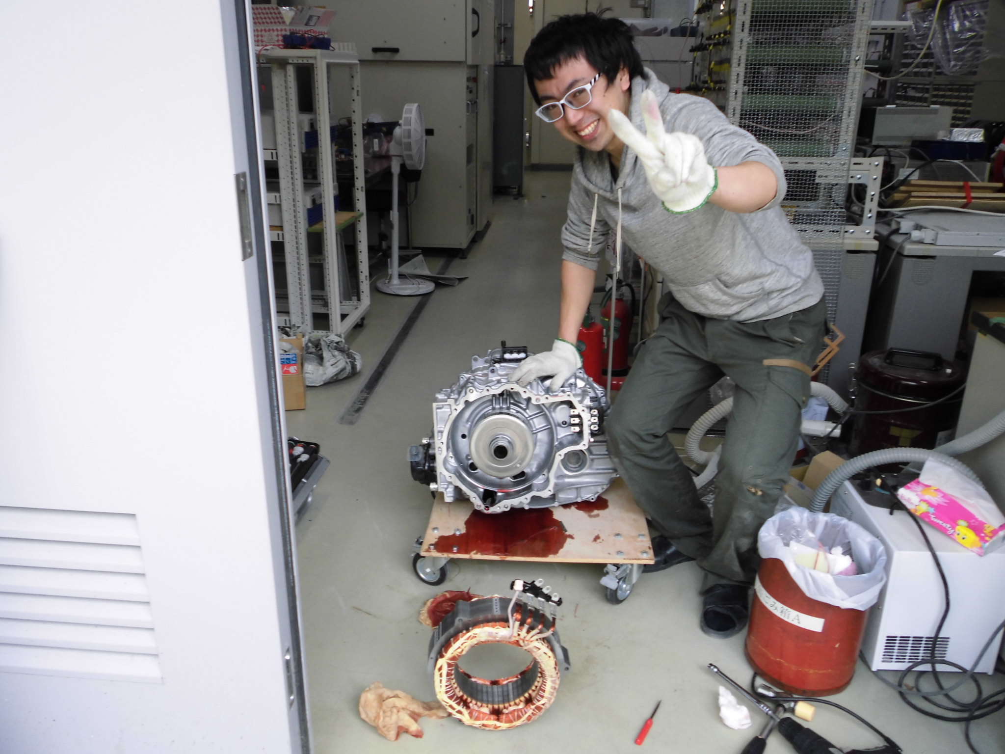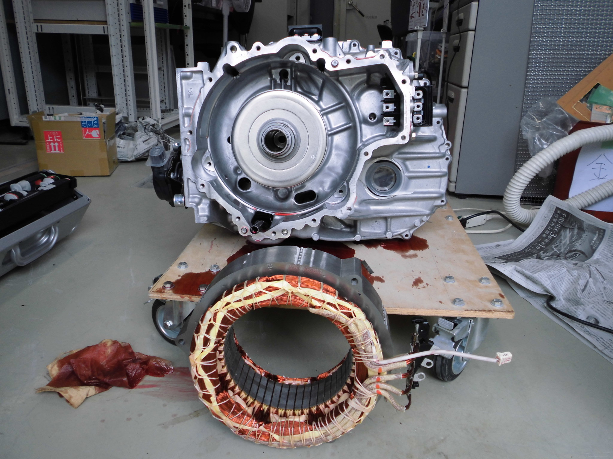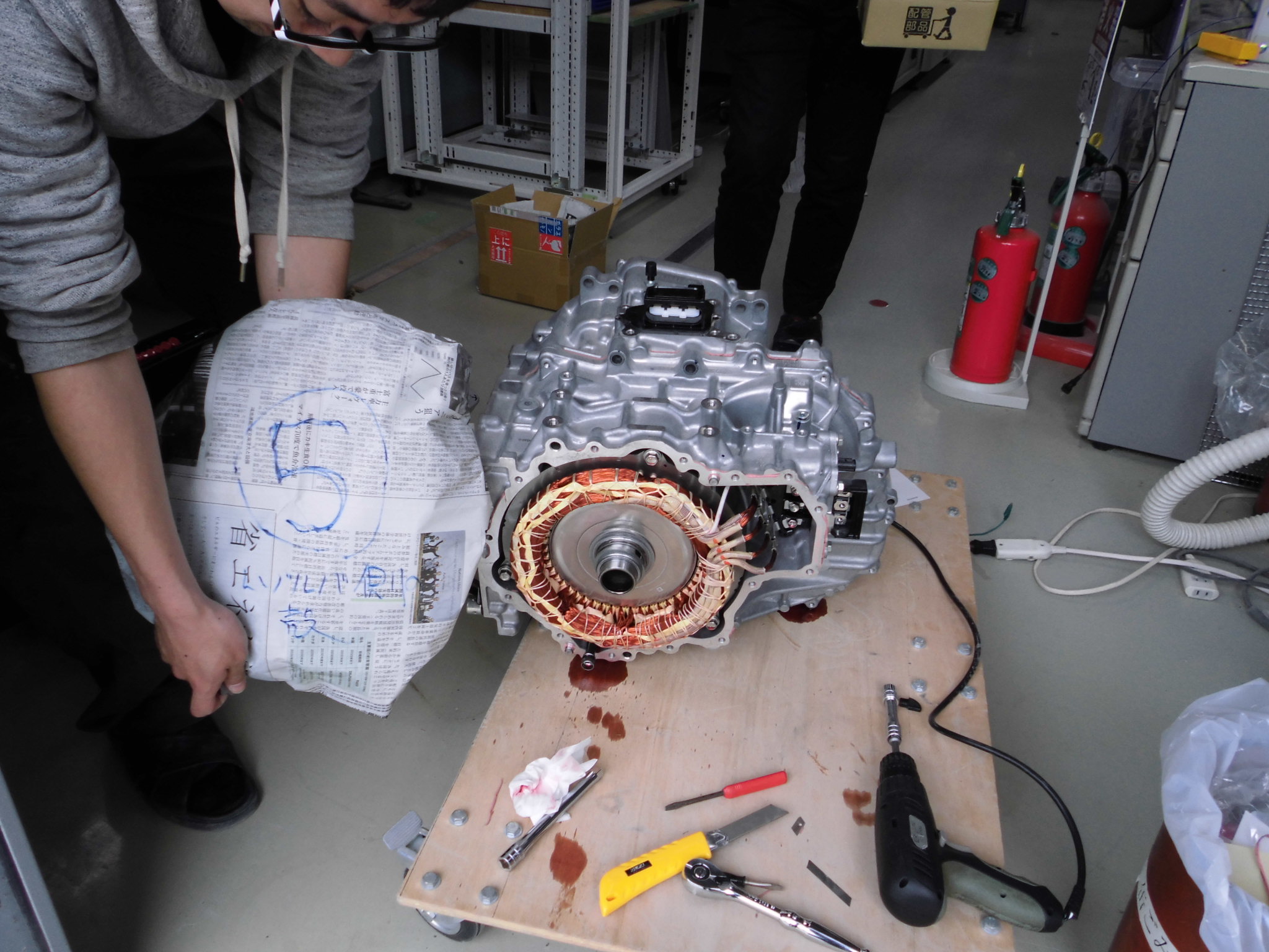 モータ固定子を外すのが無茶苦茶大変だった 舟木先生(握力80kg)井渕先生(元チャリ部)林(元落語研究会)の怪力自慢の精鋭を以ってしても大変だった。コツは気合。